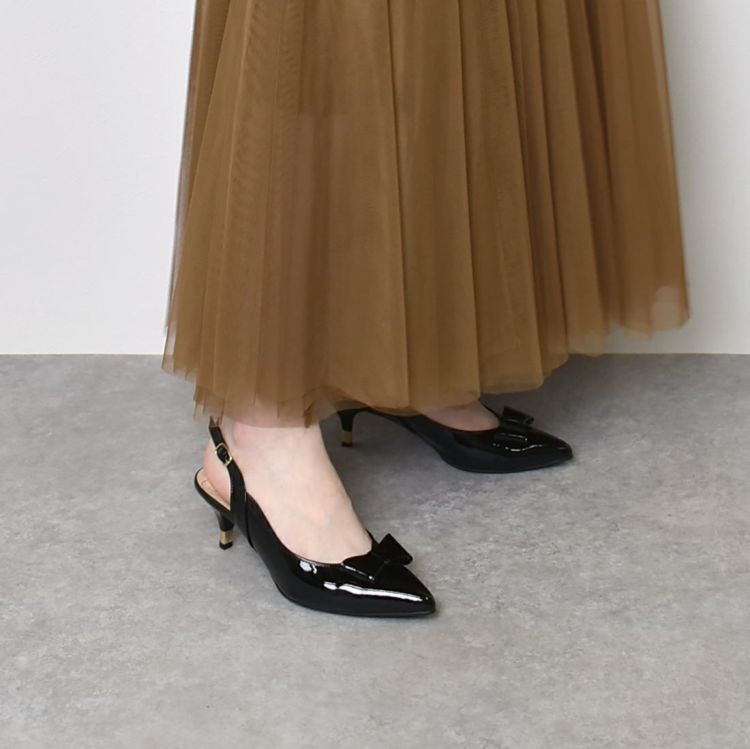 エレガントでフェミニンな印象のバックベルトパンプス。