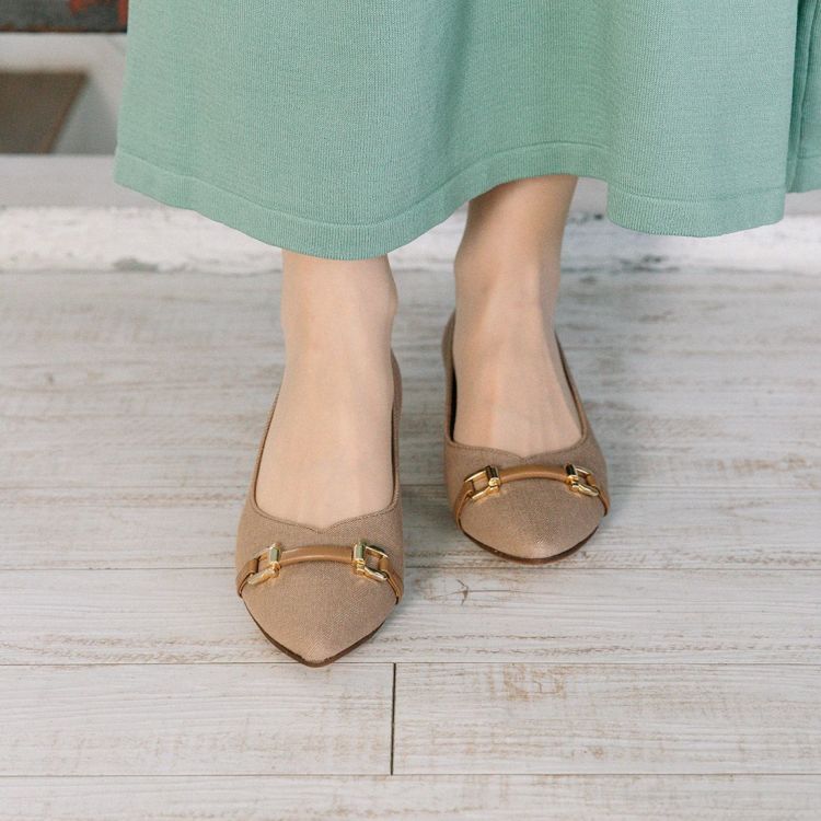 ビット風のゴールド飾りと合皮を組み合わせたモチーフがリッチなリュクス感のある雰囲気を演出。甲の小さなVカットがさりげなく女性らしさをアピール。パンツスタイルにはもちろん、フェミニンなスカートとも相性の良く、汎用性の高いアイテムなのでオンオフ活躍間違いなし。アーモンドトウの優しいシルエットで足入れ感も良く、気負いなく履いていただける1足です。クッション性のある中敷で履き心地の良さも嬉しいポイント。