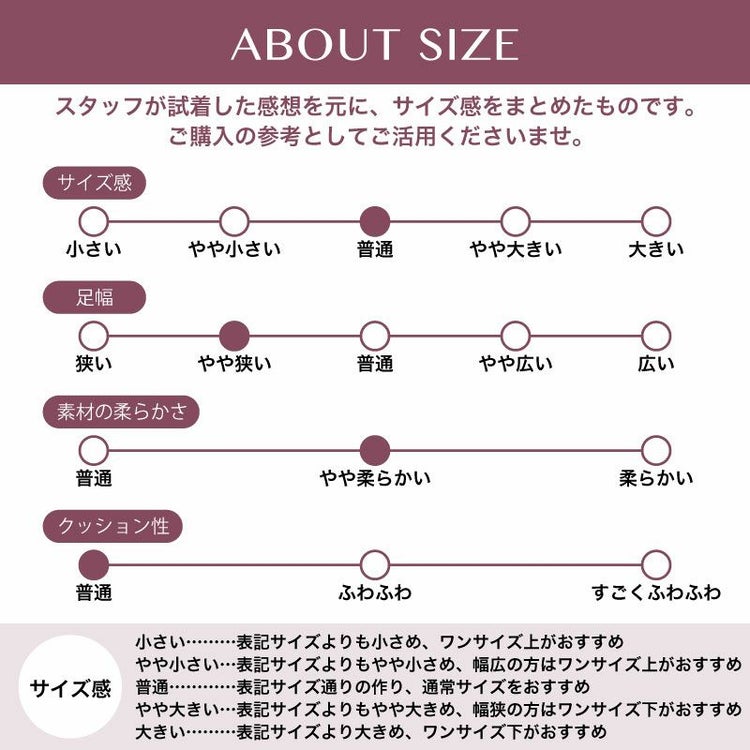 36(23cm-23.5cm)、37(23.5cm-24cm)、38(24cm-24.5cm)、39(24.5cm-25cm)
