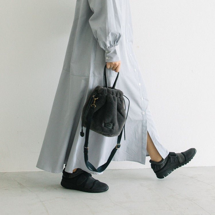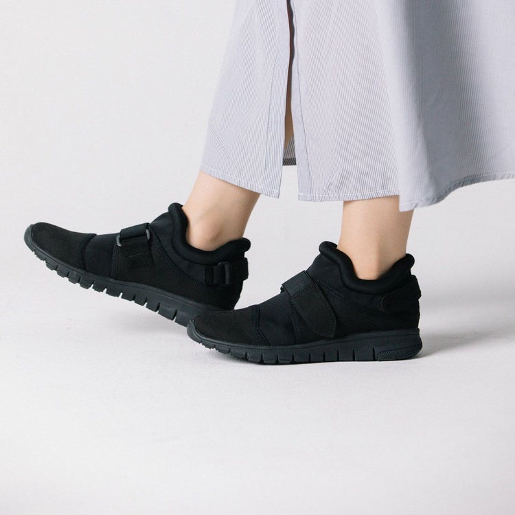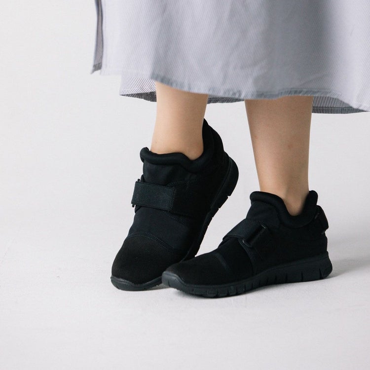 ベルトデザインがスタイリッシュなスニーカー。軽さとフィット感、デザイン性を兼ね備えており、大人女性でも履ける1足。ソフトな仕立てなので足あたりが柔らか。ベルトで調整できるのも嬉しい。撥水加工を施しており、天気が不安定な日でも履いていただけます。※完全防水ではありません。