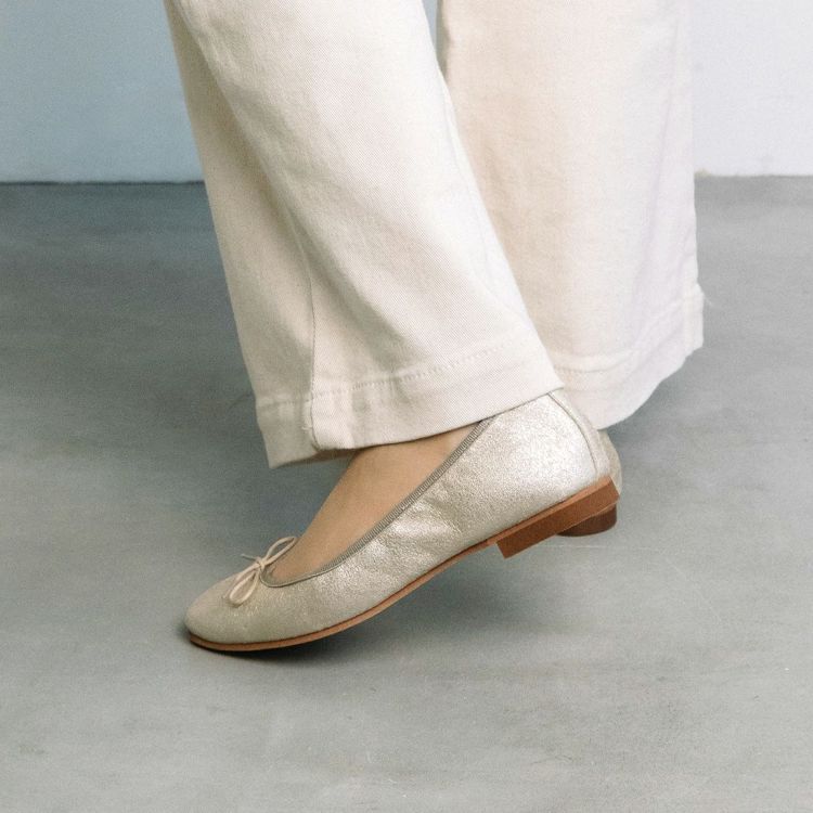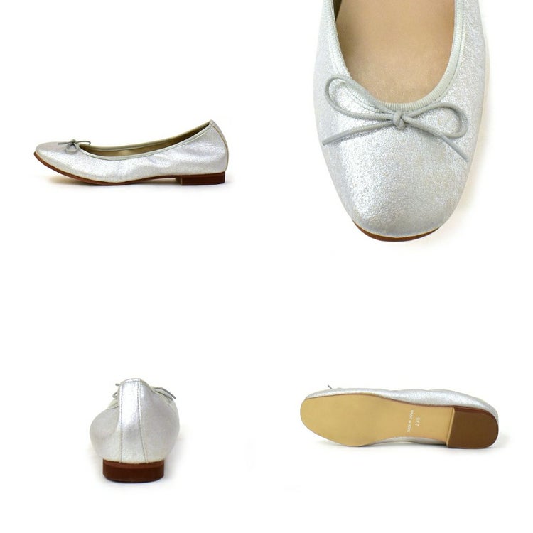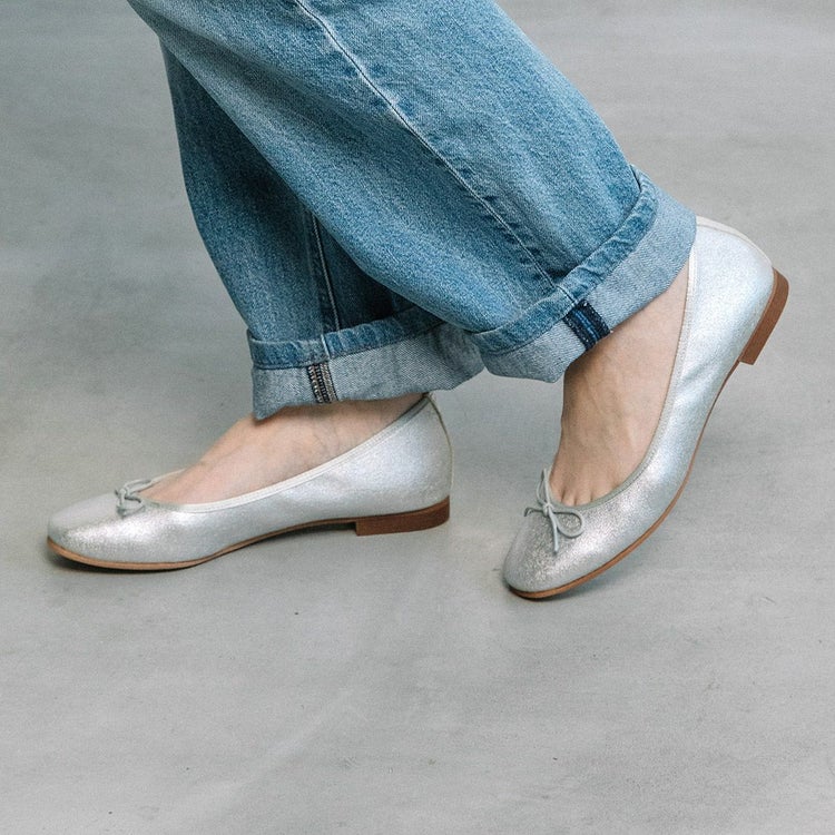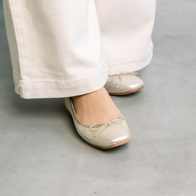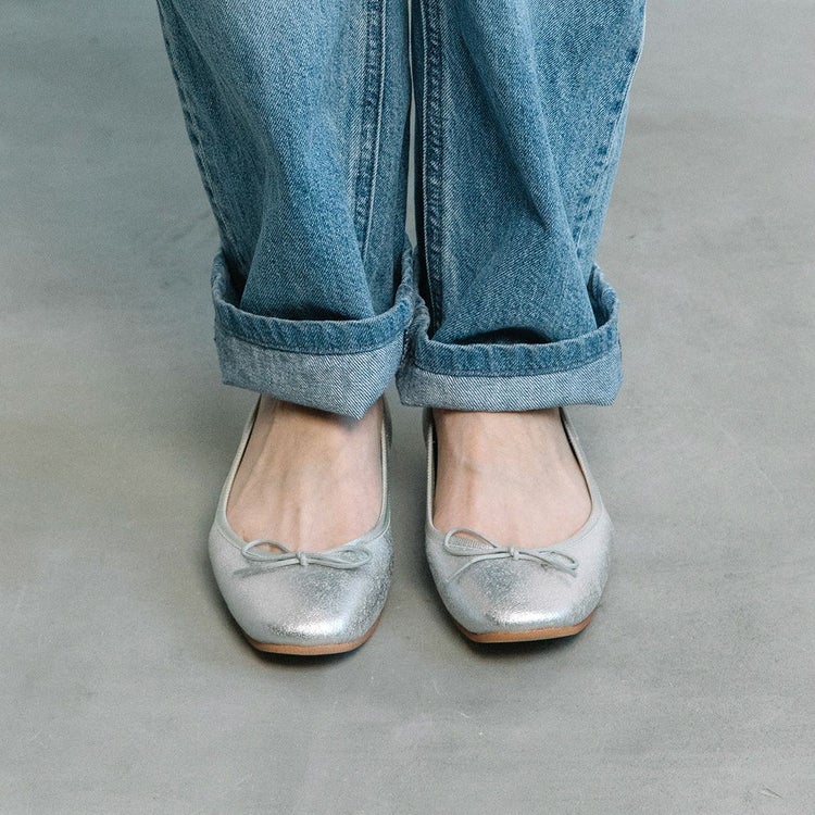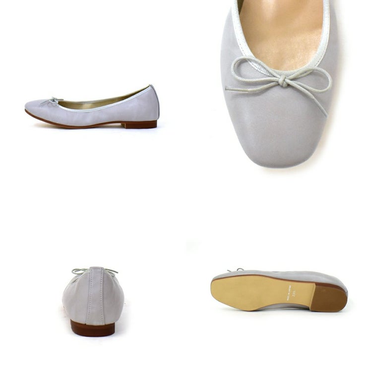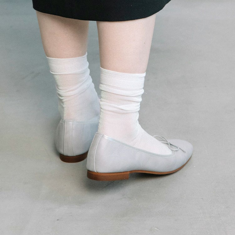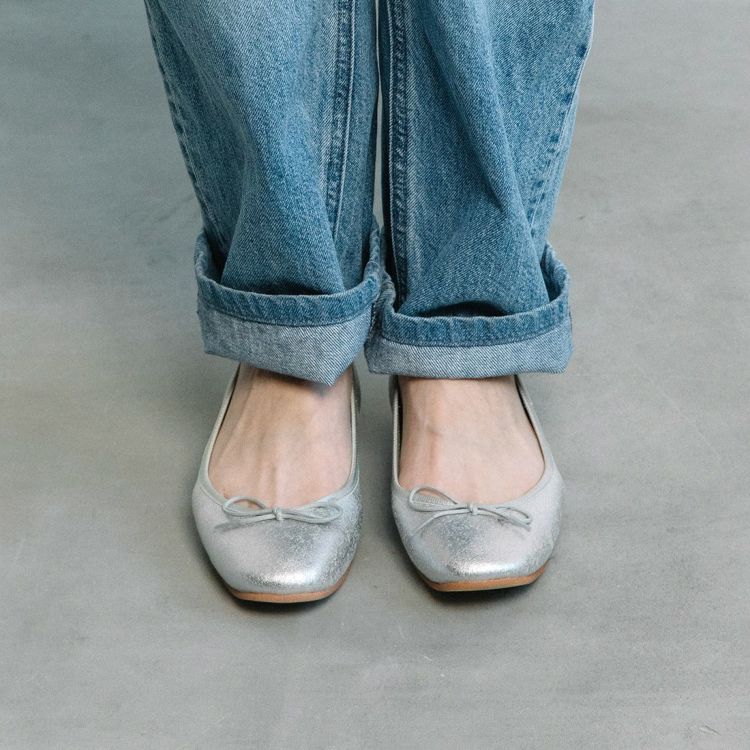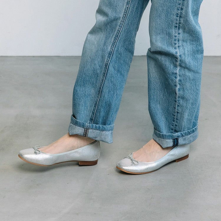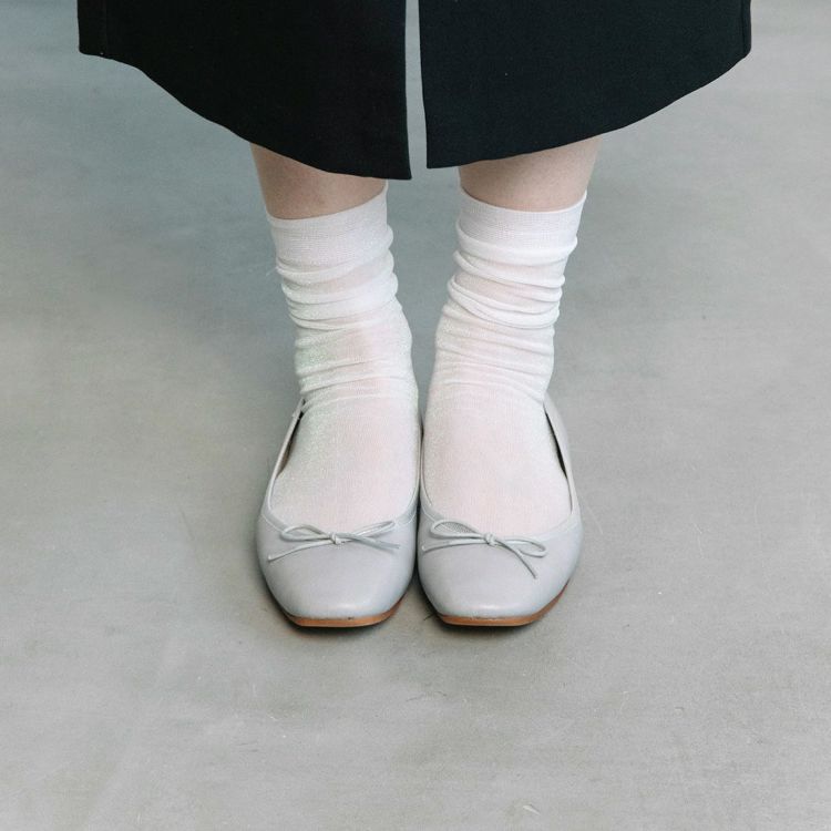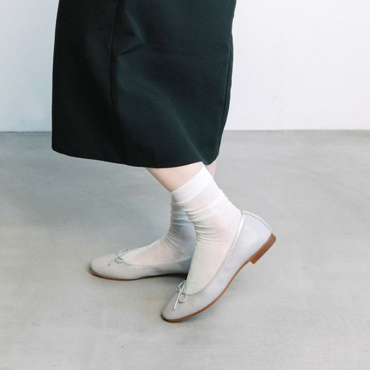 紐リボンがフェミニンなスクエアトゥバレエシューズ。