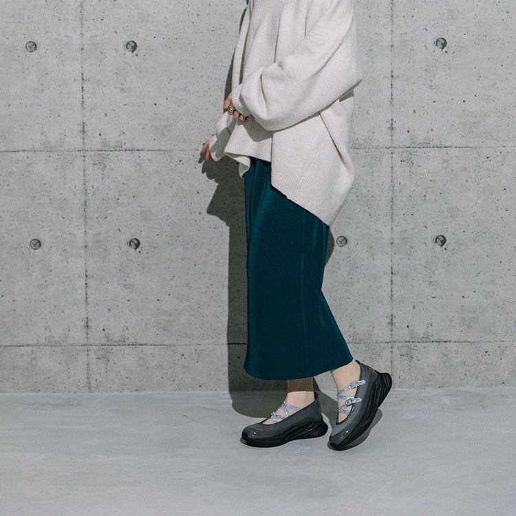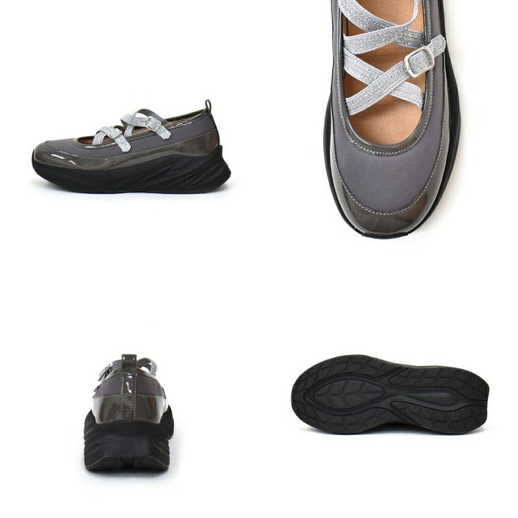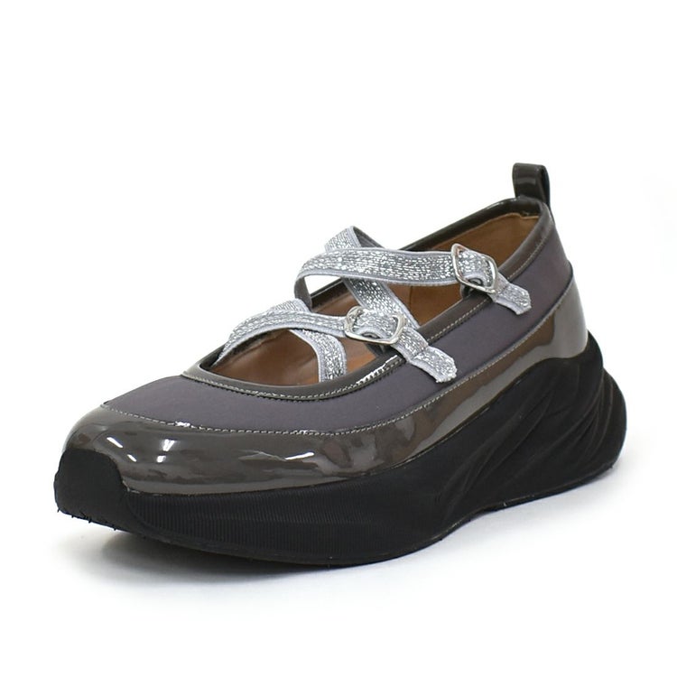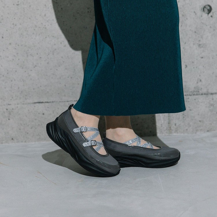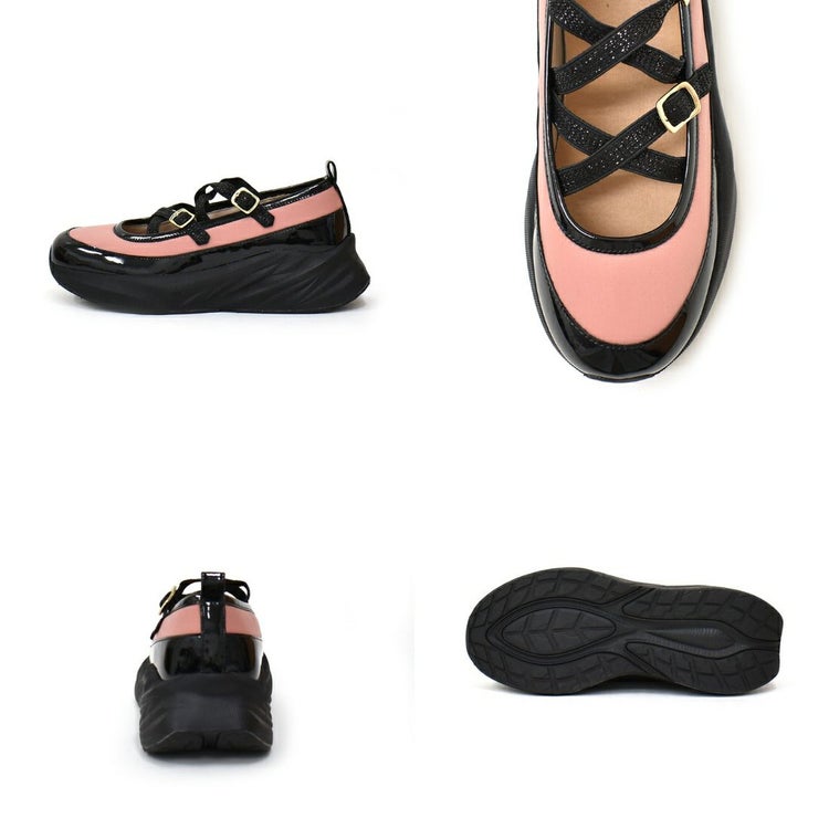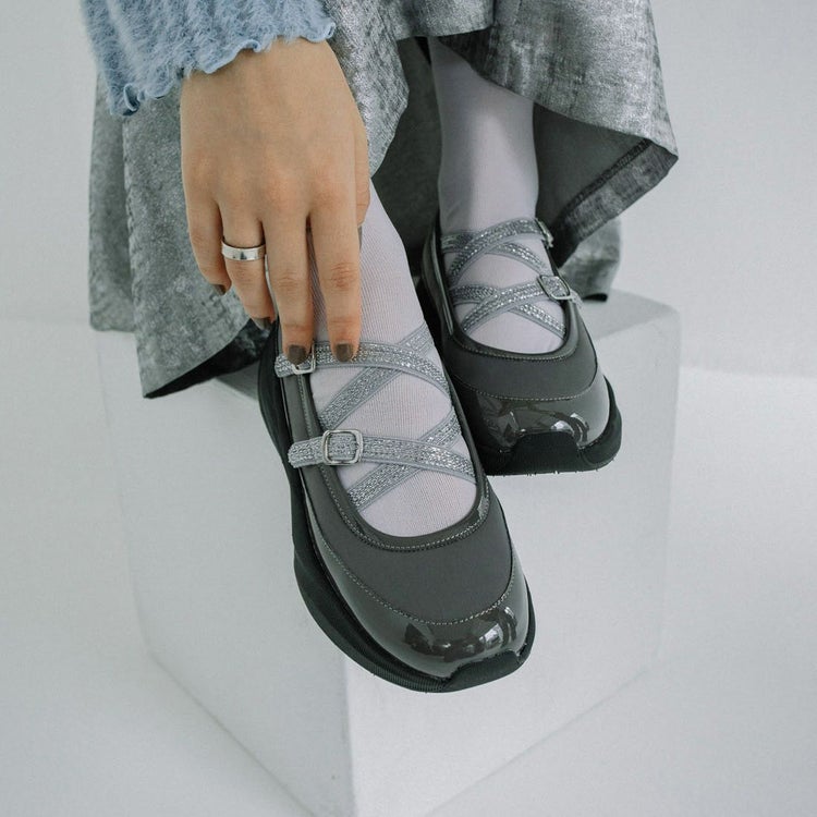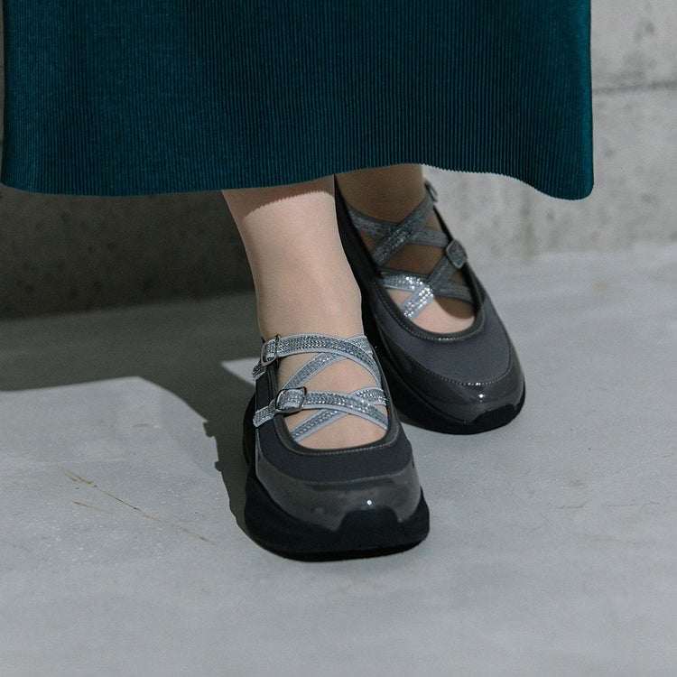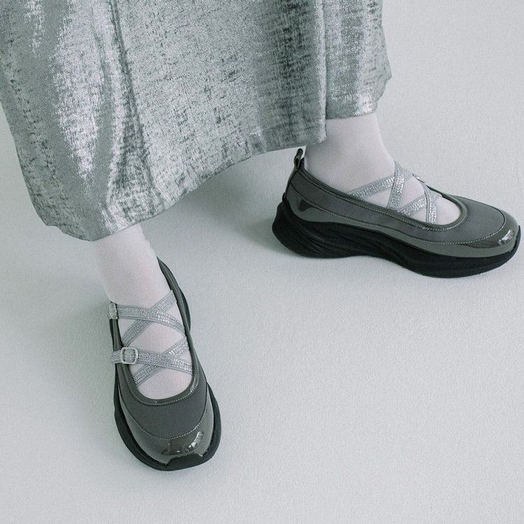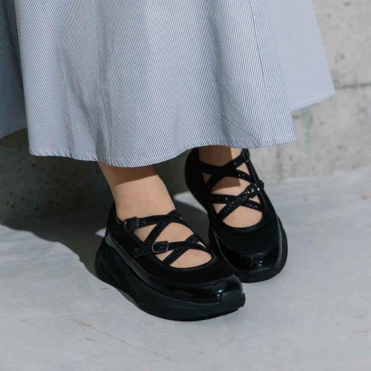 光沢のある素材と異素材を組み合わせることで、スタイリッシュかつ個性的な印象に仕上げています。目を引くのは、きらめくラメのダブルクロスストラップ。メリージェーン風の可愛らしさを残しながらも、スポーティーさとモード感を兼ね備えたユニークなデザインが特徴です。厚底ソールは、スタイルアップ効果はもちろん、クッション性も高く歩きやすさも抜群。
