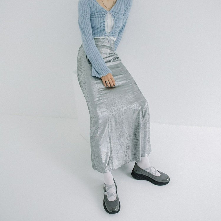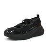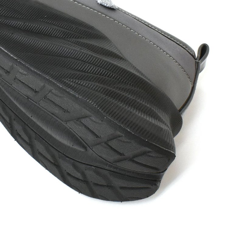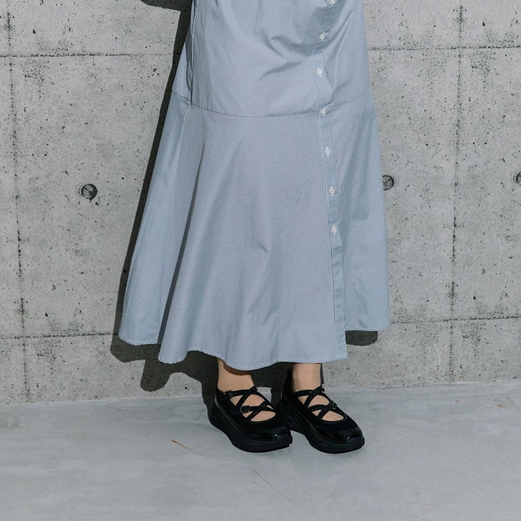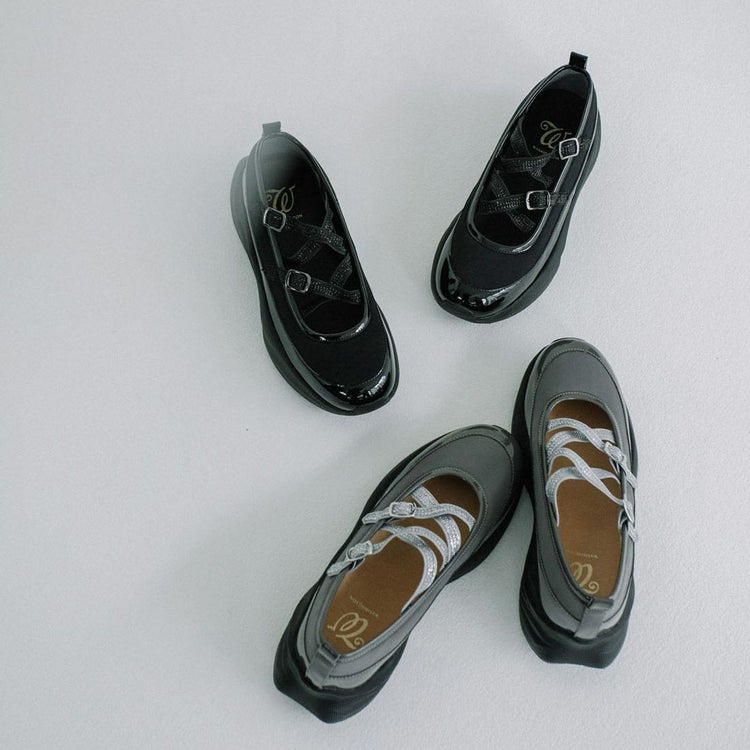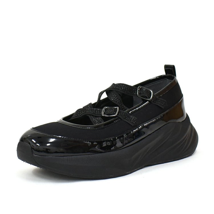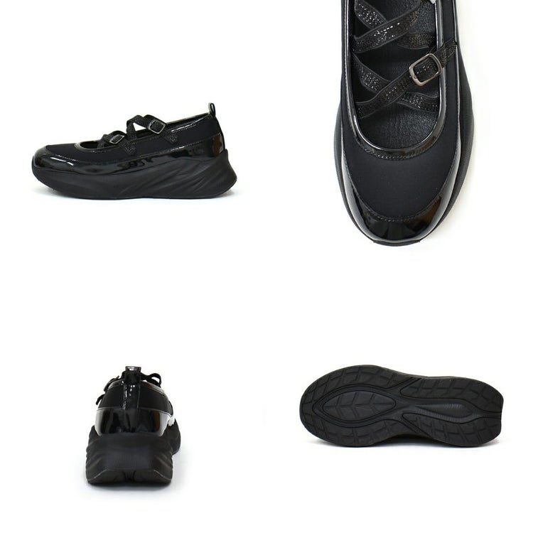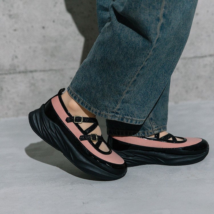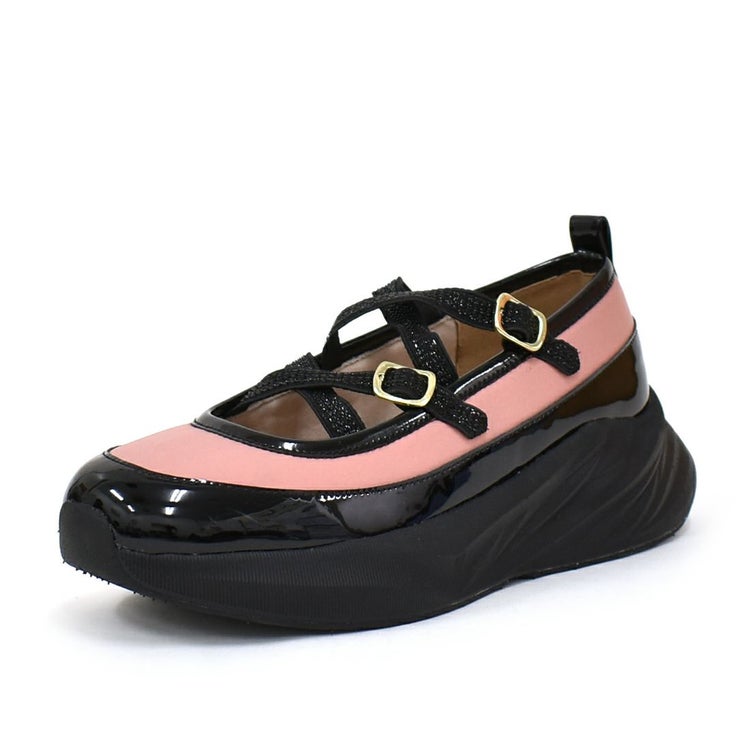 光沢のある素材と異素材を組み合わせることで、スタイリッシュかつ個性的な印象に仕上げています。目を引くのは、きらめくラメのダブルクロスストラップ。メリージェーン風の可愛らしさを残しながらも、スポーティーさとモード感を兼ね備えたユニークなデザインが特徴です。厚底ソールは、スタイルアップ効果はもちろん、クッション性も高く歩きやすさも抜群。