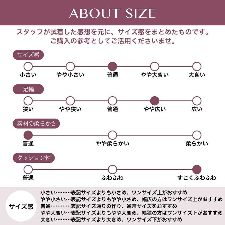 ・普段サイズ23cm/幅普通/着用サイズ「23cm」:ストッキングで履いていつものサイズでぴったりでした。甲のクロスになったゴムがしっかりとホールドしてくれるので、脱げにくいのにサッと履けるのがお気に入りです!ソックスと合わせたカラーコーデにもおすすめです!
