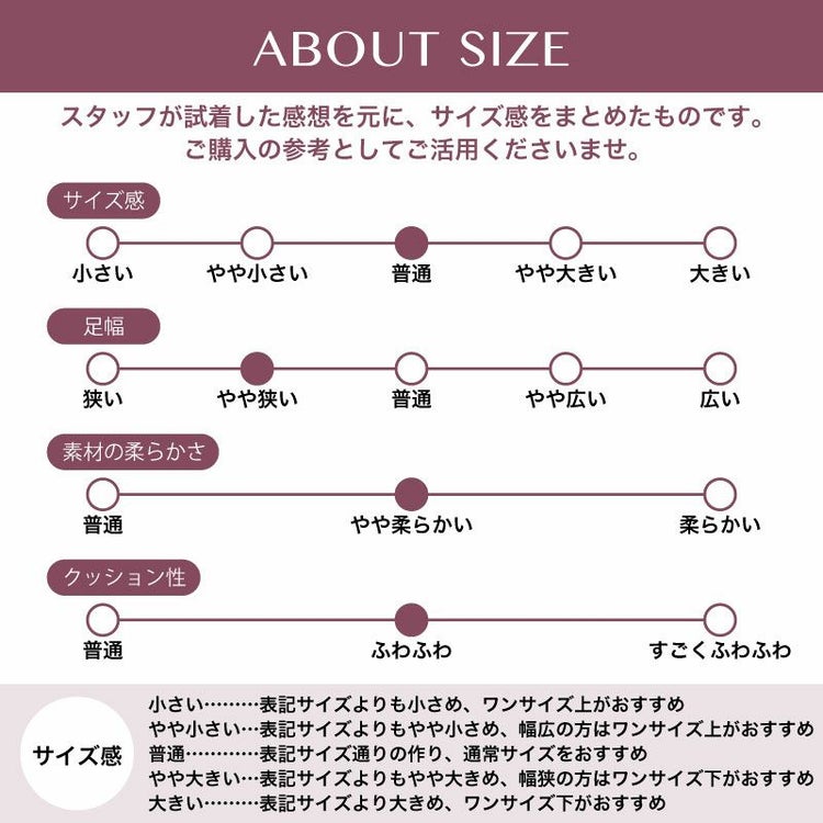 ・普段サイズ24.5cm/甲標準/幅標準(着用サイズ「24.5」):普段、かかとが脱げやすいのですが全体に入ったインソールのクッション感と履き口のゴムが柔らかく足をホールドしてくれてフィットします。底材の反り返りも良く、やわらかいので立ちっぱなしや良く歩く日にも重宝しそうです。