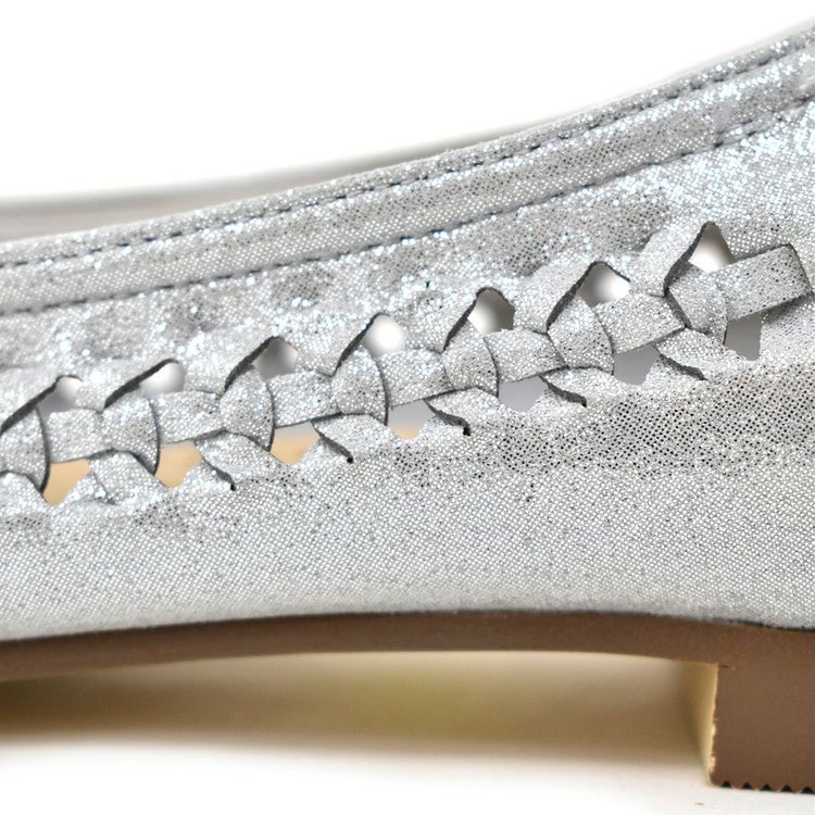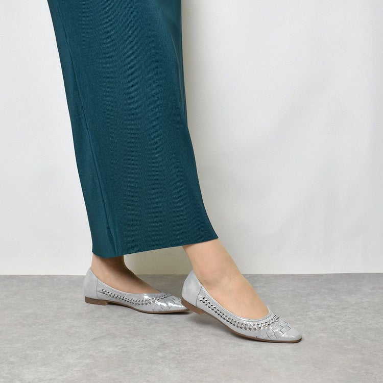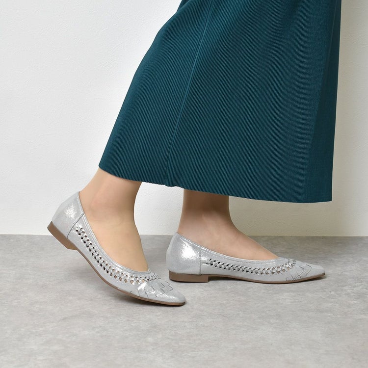 ・普段サイズ23cm/幅細/着用サイズ「23cm」:EEなので少し幅が細身に感じましたが、素材が柔らかく履いていくと馴染むので普段のサイズでぴったりでした。パンプスだと暑い時期も、このデザインだと涼しげで上品に見えます。また細かなラメが女性らしく、オフィス使いにもできそうです。