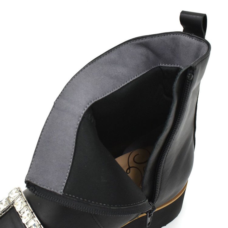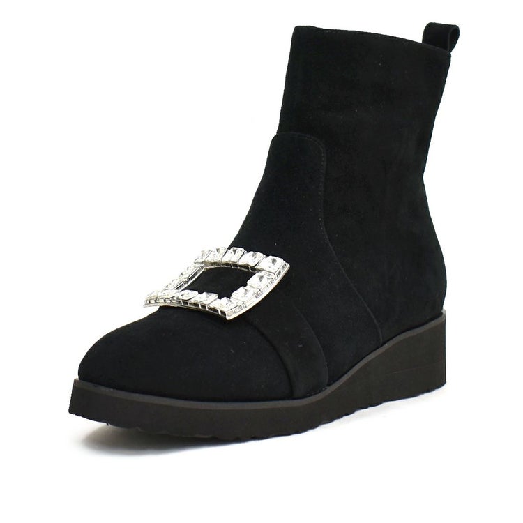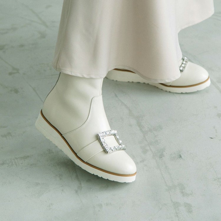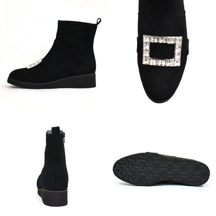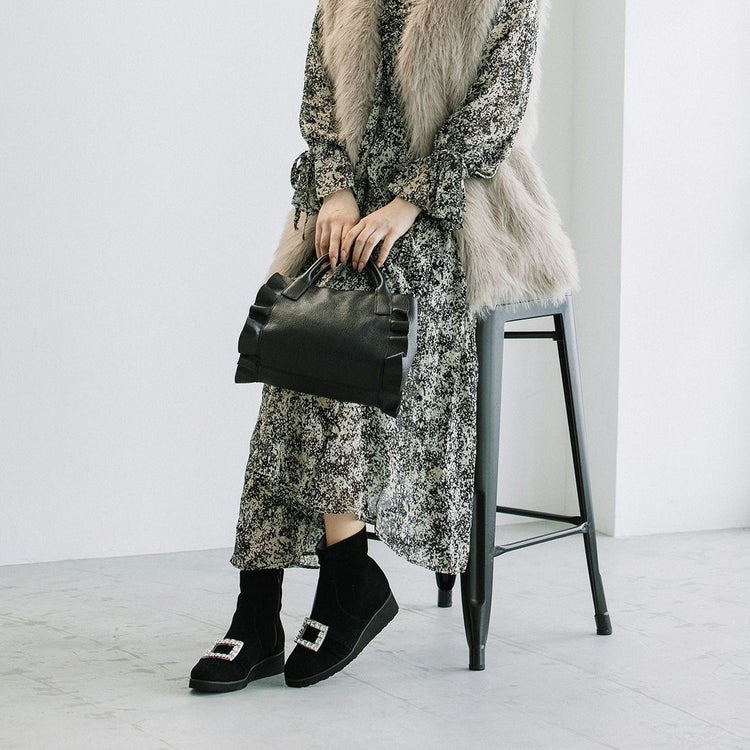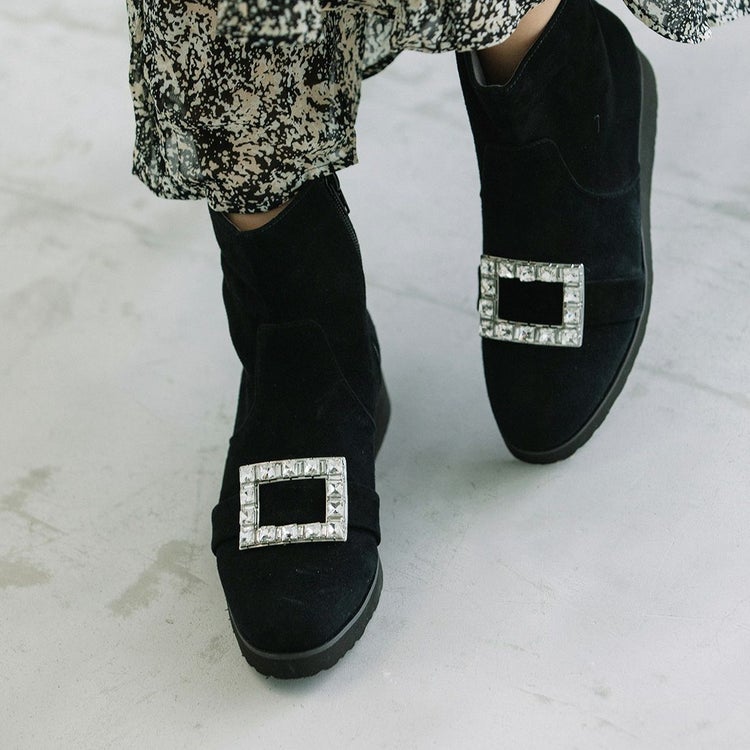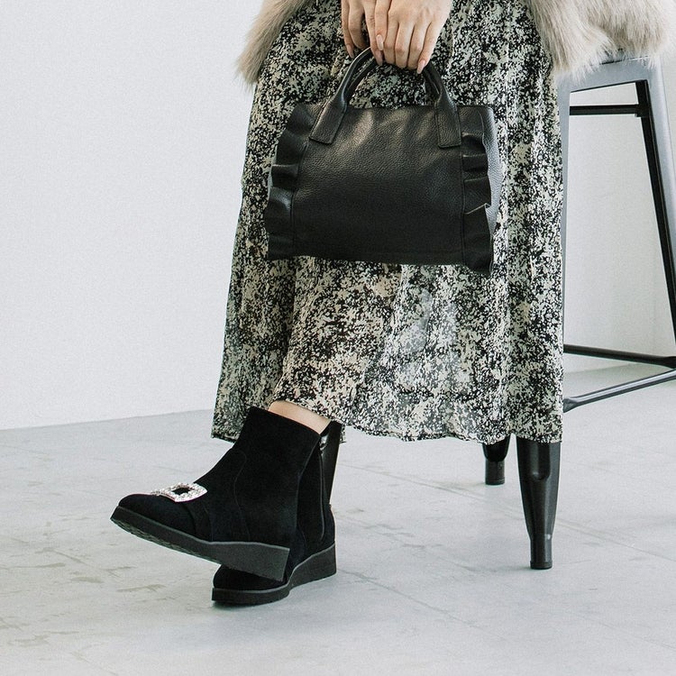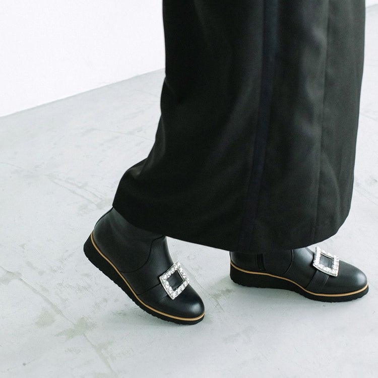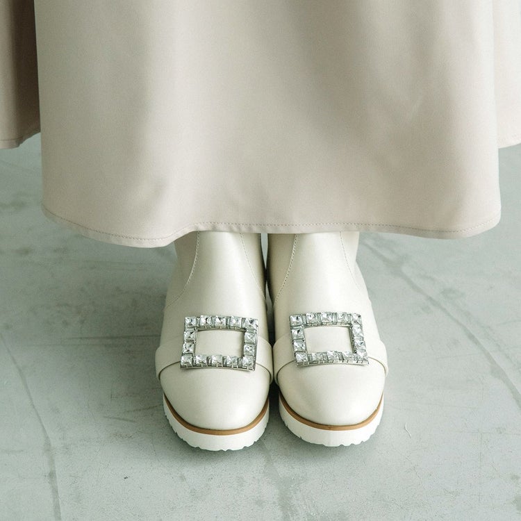 カジュアルな印象のシンプルブーツにフェミニンなビジューバックルをプラスすることで一気に女性らしさがアップ。フェミニンテイストとカジュアルスポーティテイストがミックスされたアイテムは、デイリーにも休日にもおすすめ。裏材は起毛感のあるスエード素材を使用しているので足当たりもソフト。軽量で柔らかい素材を使用しているので履きやすく、疲れにくいのも嬉しい。