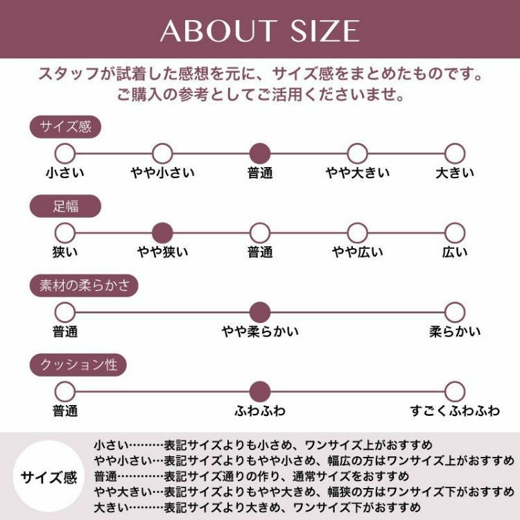 ・普段サイズ23cm/幅細/着用サイズ「23cm」:コットンの靴下で履いて23.5センチだと、ちょっと緩いです。前に中敷きを敷いて、履けば問題なさそうです。ストッキングで履く場合は、普段のジャストサイズでぴったりです。