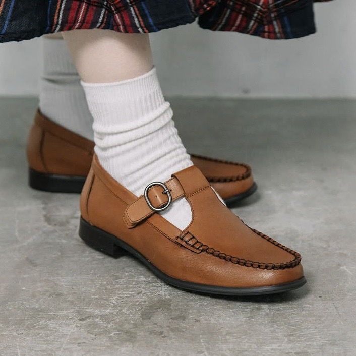 ベージュワイドパンツ×キャメルのTストラップシューズ