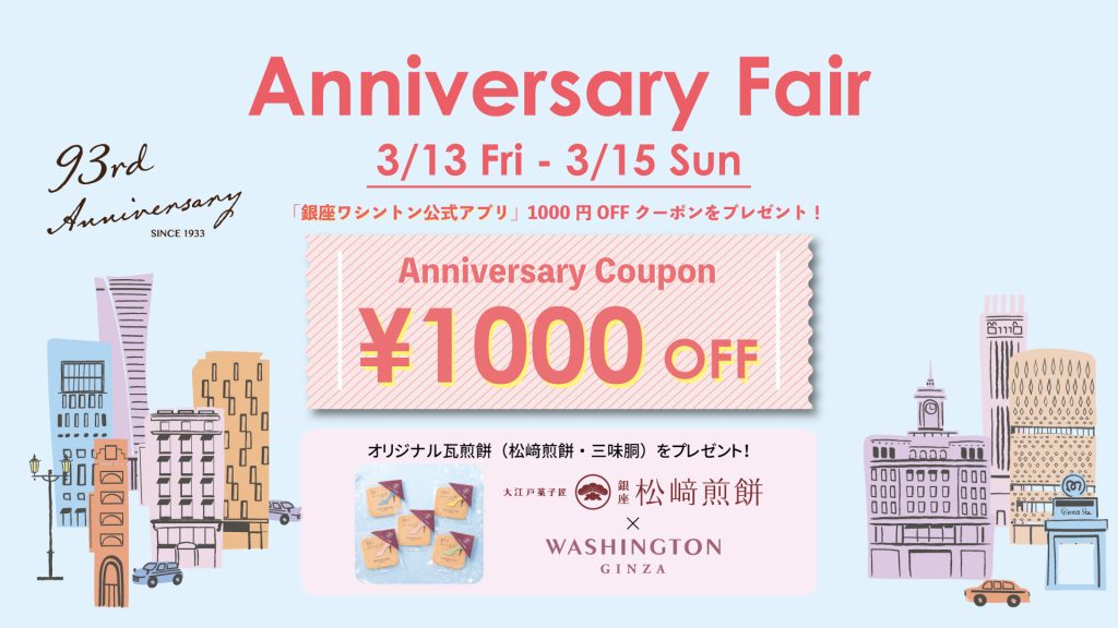 日頃のご愛顧に感謝を込めて、3月13日(金)〜3月15日(日)の期間、GINZA WASHINGTON・WASH各店にて、アニバーサリーフェアを開催いたします。