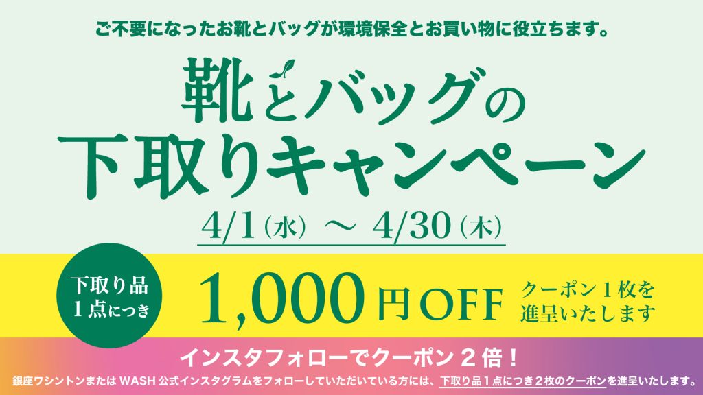 GINZA WASHINGTON・WASH各店では4月1日(水)〜4月30日(木)の期間、〈 靴とバッグの下取りキャンペーン 〉を開催いたします。
